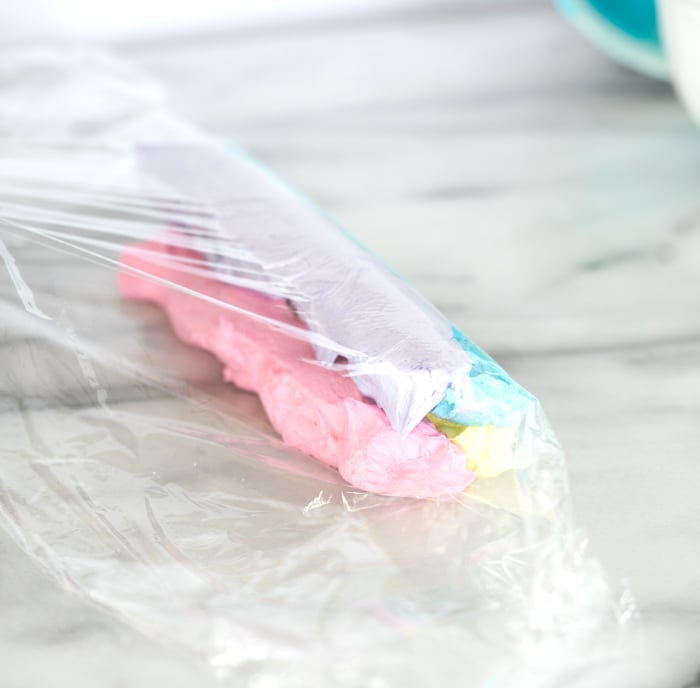 A. Rather than using a spatula or spoon youย can put each color in a piping bag and pipe it onto the plastic wrap if you choose. I chose to show it with the spatula because not everyone has a lot of piping bags laying around ๐ .ย